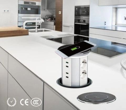 Divinity LLC's Desktop Sockets or cable cubbies is a versatile solution for kitchens, conference tables, office desks, luxury hotels, and more. these desk with cubbies come With 1-4 universal power sockets, 1-2 USB configurations, and a Bluetooth speaker, it offers convenient power access in both automatic and manual models.